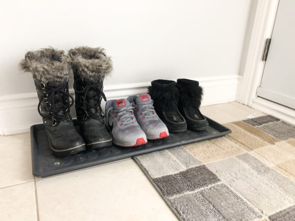 – Bandeja plástica (boot tray) para colocar botas e sapatos. Assim quando a neve que está grudada nos calçados derrete, não suja o chão.