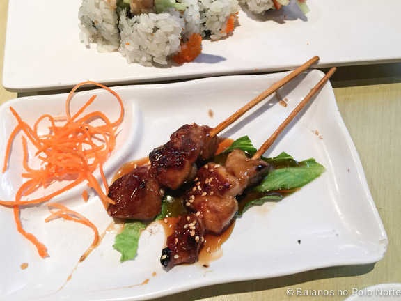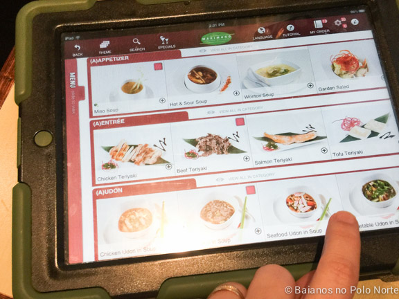 No rodízio deles as comidas não ficam prontas, nós precisamos escolher e pedir o que queremos. Aliás todos os rodízios de japonês aqui funcionam da mesma forma. O cardápio do Makimono fica num iPad em cima da mesa, a gente vai pedindo e espera o garçon trazer. O problema é só decidir quem vai ficar com o iPad 😉