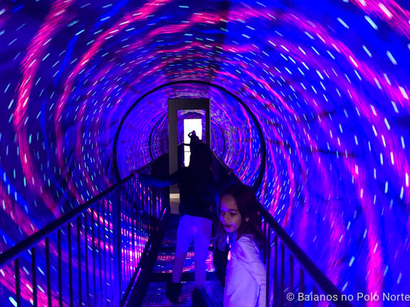 Em Toronto, o espaço tem 437 metros quadrados, decoração minimalista e mais de 70 instalações, que vão de pequenos brinquedos de madeira a experiências mais intensas, como o Vortex Tunnel. Apesar de não estarmos rodando, é quase impossível cruzar esse túnel sem perder o equilíbrio. Eu não conseguia nem olhar que começava a passar mal.