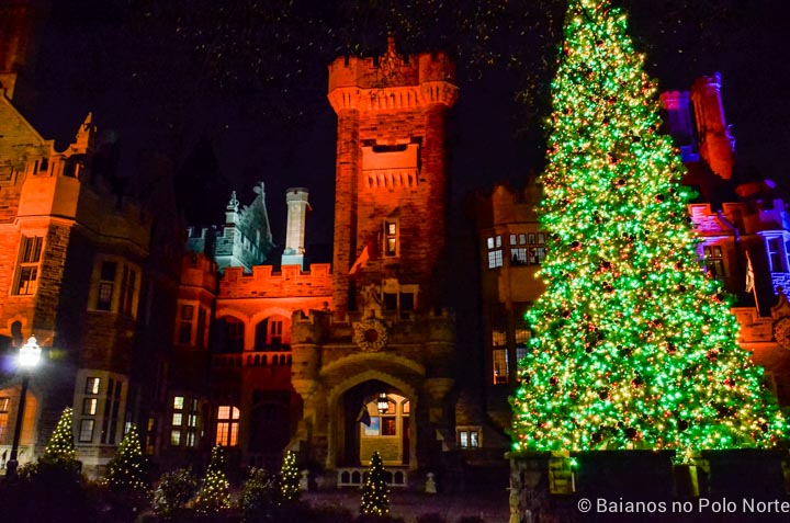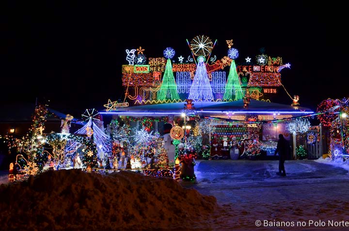 Além dos pontos turísticos, também gosto de dirigir pelas ruas dos bairros residenciais a procura das casas onde os donos capricham na decoração de Natal. Algumas pessoas não poupam esforços e fazem cada coisa impressionante. Parece uma bobagem mas me enche de alegria ver tantas luzes coloridas (risos). Até fiz uma lista com os endereços de casas com luzes de Natal super elaboradas aqui em Toronto. Essa aí na foto abaixo é a mais famosa de todas. Eles fazem para arrecadar fundos para o Sick Kids Hospital.