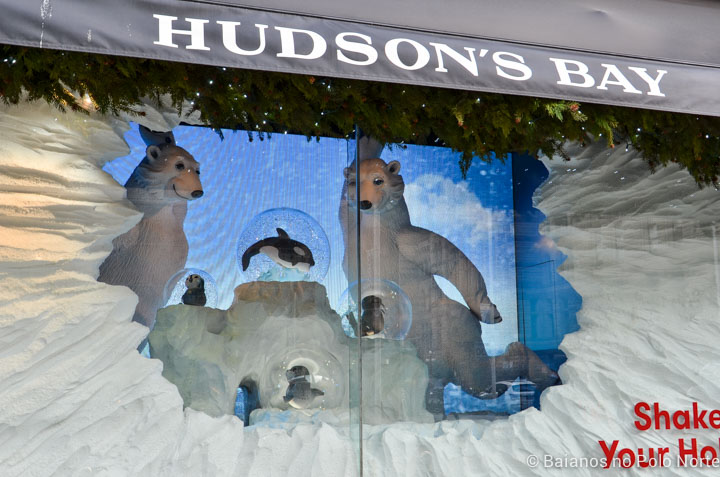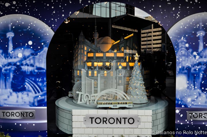 Todos os anos a loja departamento The Bay, no centro de Toronto, faz uma decoração linda em suas vitrines. Eles já fazem isso desde 1914 e as vitrines se tornaram um ponto turístico nos meses de novembro e dezembro. Lembro de decorações incríveis, com miniaturas de cidades e bonecos animados. Para quem não sabe, eu trabalhava no escritório deles, nesse prédio, então ficava boba todos os anos. Amei o que eles fizeram em 2017, tem até uma miniatura da prefeitura, ursos polares e floresta encantada. A loja está localizada na Queen St, esquina com a Yonge St.