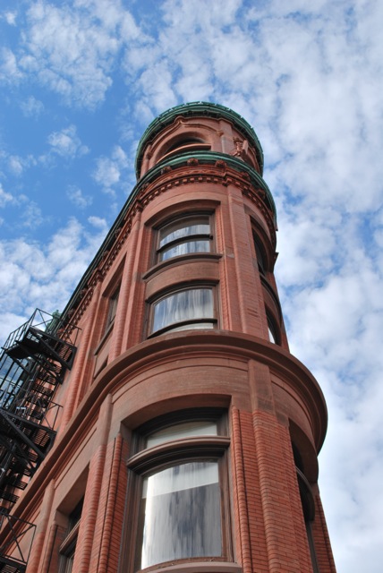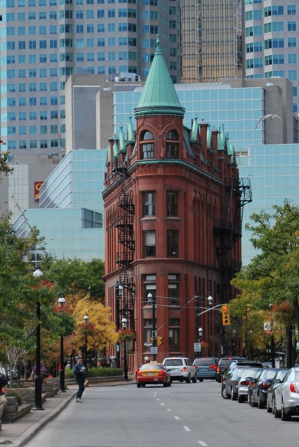 Esse é o Gooderham, ou Flatiron Building, localizado na parte antiga do centro de Toronto. Foi construído em 1892, antes mesmo do famoso Fuller Building em Nova York. Era sede dos escritórios da destilaria Gooderham & Worts. Está localizado no 49 Wellington St E, bem pertinho do St. Lawrence Market.
