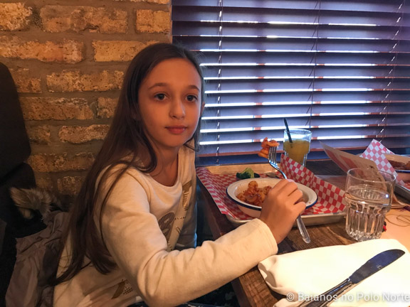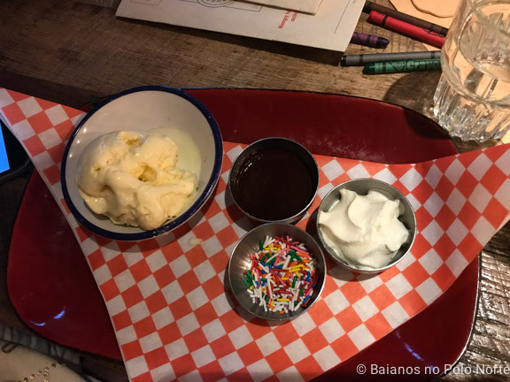 As meninas foram de macarronada com molho de tomate, do menu infantil. Aliás o menu dos pequenos inclui suco e sorvete com calda, chocolate granulado e chantilly para a criançada misturar na mesa. Elas curtiram preparar a própria sobremesa.