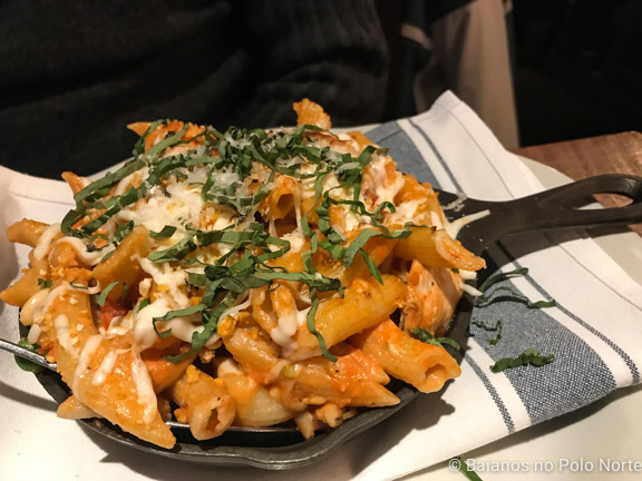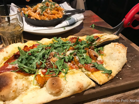 Para jantar pedi uma pizza do menu especial chamada de The Spice Pizza, com salami soppressata, batata doce frita, mussarela, pesto, mel, rúcula e pecorino. Mistura meio doida mas que resultou num sabor delicioso. A massa deles é super leve e uma das melhores que já comi em Toronto (também gosto da pizza do Marcello’s e da Libretto). Estava gostosa porém bem picante, então só recomendo se você gostar de pimenta.