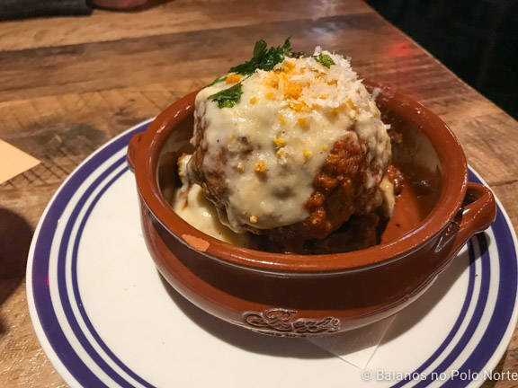 Uma coisa curiosa é que a meatball deles é gigante, tem uns 10cm de diâmetro e pesa quase 230g. Pedimos uma de entrada e ela sozinha já dava quase uma refeição, simplesmente deliciosa! E as almôndegas são assim enormes mesmo nos pratos com macarrão, como Spaghetti & Meatball.