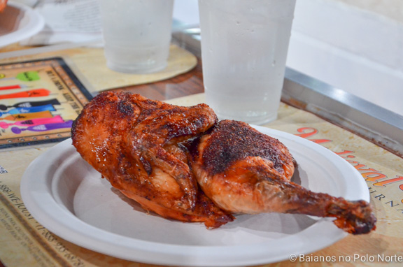 A refeição padrão vem com pão de alho, sopa de tomate, metade de um frango, batata assada, milho cozido, uma sobremesa e 2 rodadas de refrigerante ou água. O detalhe é que comemos com as mãos!