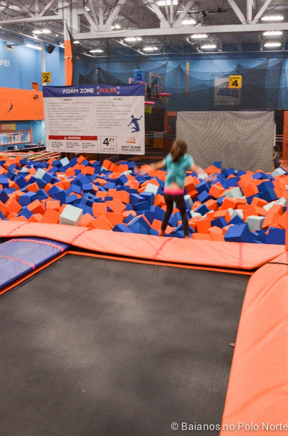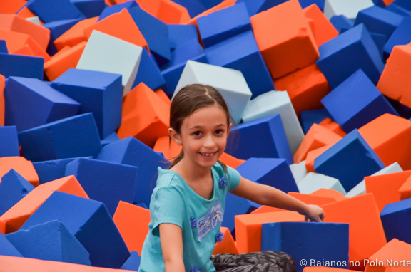 - Foam zone – nessa área tem uma piscina de cubos de borracha bem macios. A gente pula no trampolim e se joga na piscina. Confesso que fiquei com muita vontade viu…