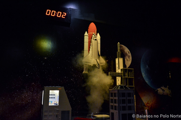 Porém, a melhor parte de todas, em minha opinião, foi a plataforma de lançamento do ônibus espacial. Tinha a mini sala de comando, o relógio com a contagem regressiva e o lançamento com direito a fumaça e tudo.