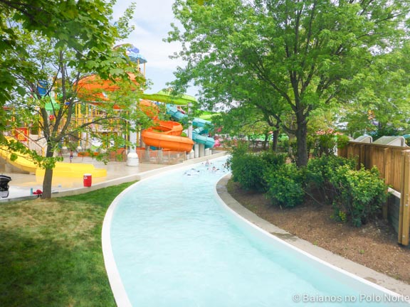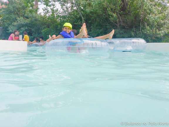 Esse é o lazy river que tem em quase todos os parques aquáticos, onde vamos relaxando na bóia. Você pode entrar e sair no lazy river em diversos pontos porém como não há um controle de quem já deu uma volta completa, algumas pessoas não saem e quem está de fora não tem bóia para entrar. Achei isso meio chato mas conseguimos brincar.