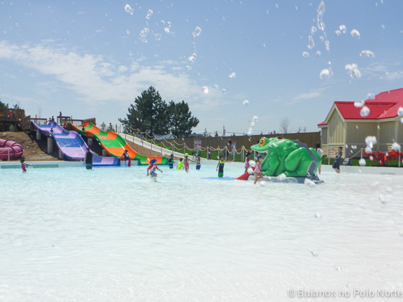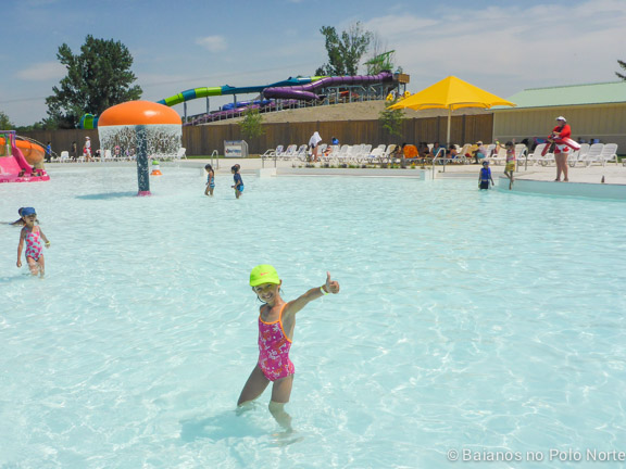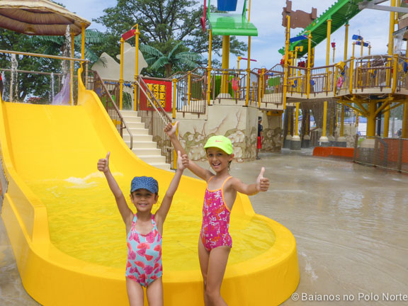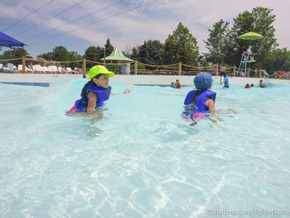 Há uma piscina enorme e bem rasa (água abaixo do meu joelho). Tem escorregadores pequenos e outros maiores, o que agradou as minhas filhas. Alguns escorregadores tem altura máxima de 122cm para poder brincar, então as crianças maiores não ficam atropelando as pequenas.