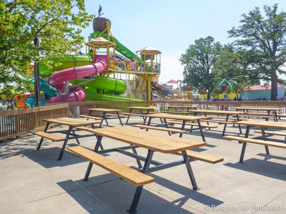 O parque é bem servido nesse departamento, não tive problemas para encontrar lugares para sentar em lugar nenhum. Próximo aos restaurantes também existem inúmeras mesas para comer, inclusive na sombra, o que para mim é um alívio. Comer no sol ninguém merece né?