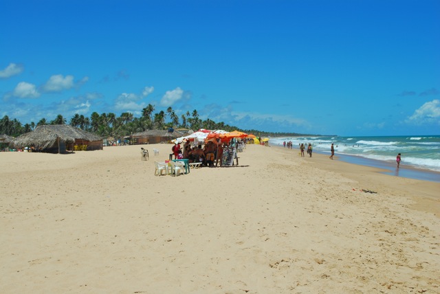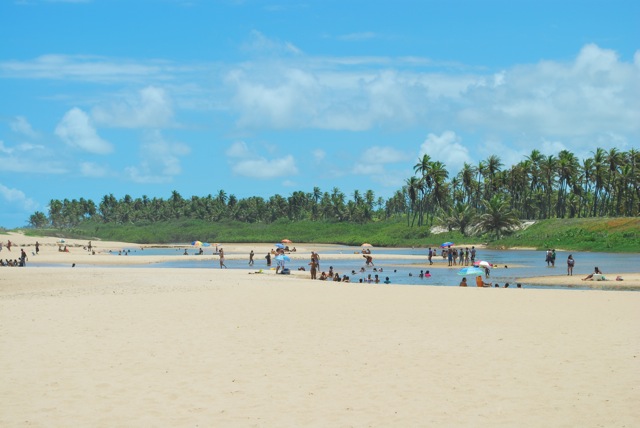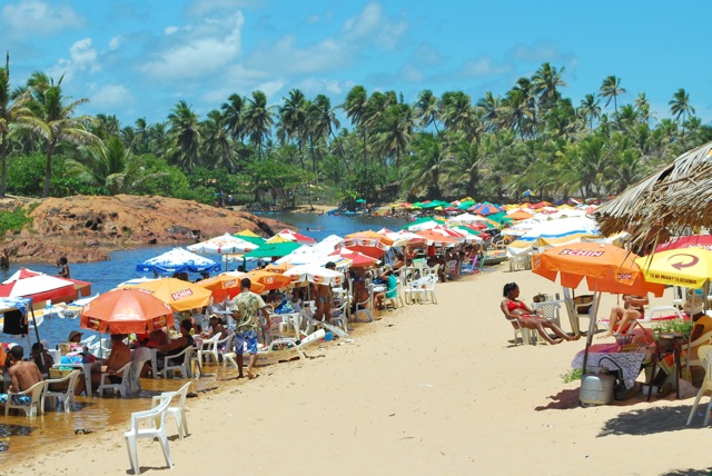 O local tem um certo movimento mas no geral é bem mais tranquilo do que Praia do Forte, por exemplo. A atração aqui não é a praia, que é muito forte, e sim o rio. As mesas ficam ao longo do rio e as barracas te servem até dentro d’água.