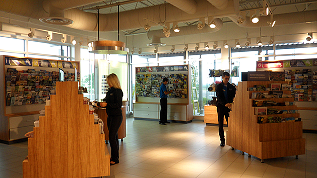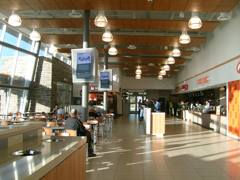 São todos iguais, exceto pelas lojas e restaurantes que mudam um pouco de um para o outro. A loja de conveniência e o Tim Hortons, que serve o cafezinho preferido dos canadenses, estão em todos os centros. Na loja de conveniência vende de tudo um pouco. Lanchinhos, souvenirs, quit de primeiros socorros, pequenas embalagens de salada/frutas/verduras cruas, cereal, sopa instantânea e até leite ou achocolatado em embalagens de 250 e 500 ml. No cantinho, perto do caixa, um microondas para você esquentar ou preparar alguma coisa que comprou na loja. Para quem viaja com crianças é perfeito!