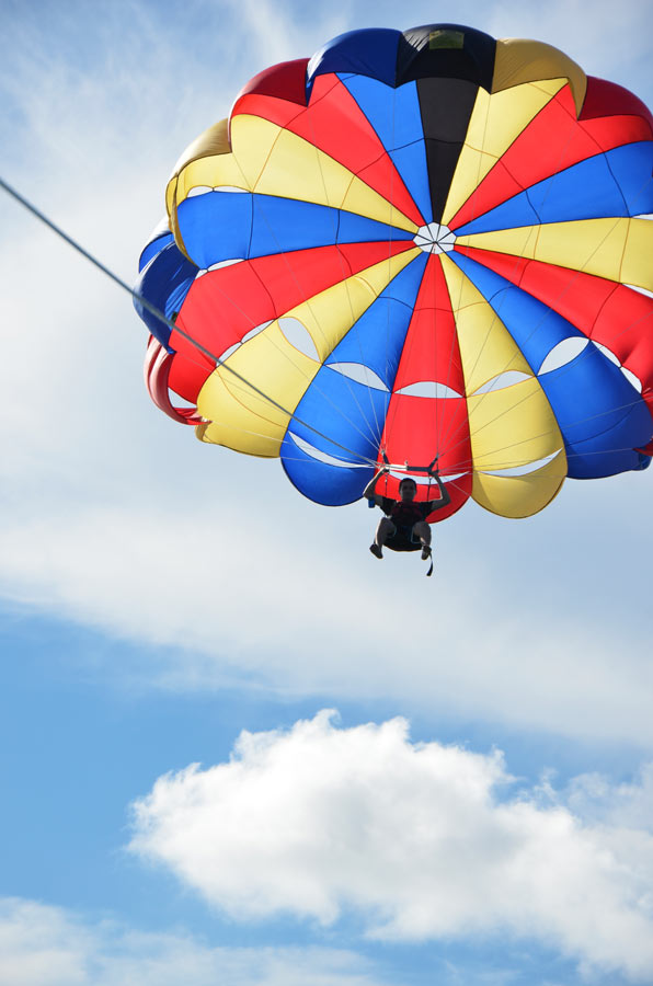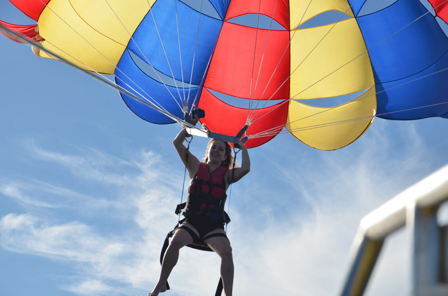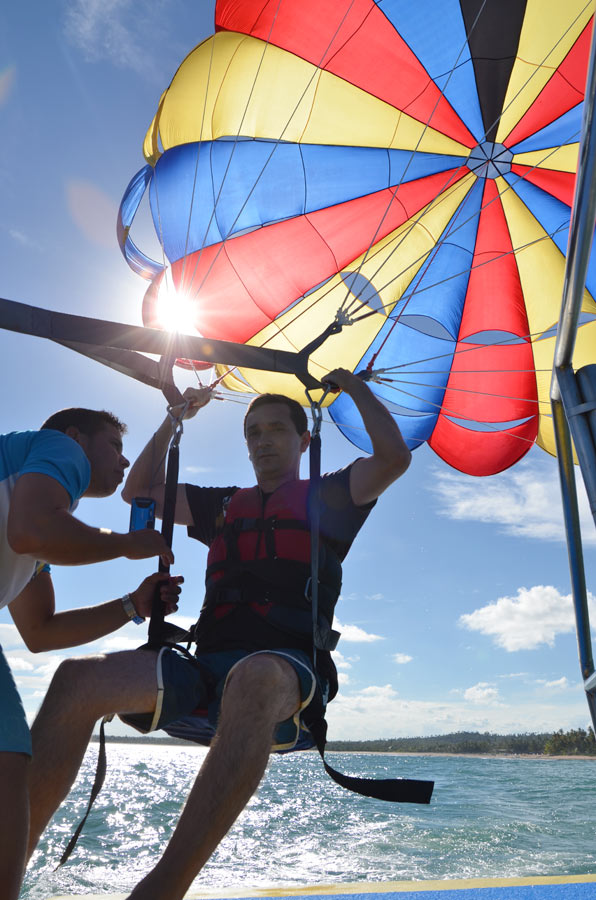 Nossa aventura começou na Praia do Porto, em frente a igreja, onde estão atracados os barcos. Não é necessário nenhum treinamento especial para fazer o passeio, basta apenas seguir as orientações de segurança do instrutor e estamos aptos a voar. Nesse parasail saimos de uma plataforma no barco e o cabo é liberado aos poucos, é o tipo mais seguro. Usamos um colete salva-vidas e ficamos conectados ao para-quedas por uma espécia de cadeira.